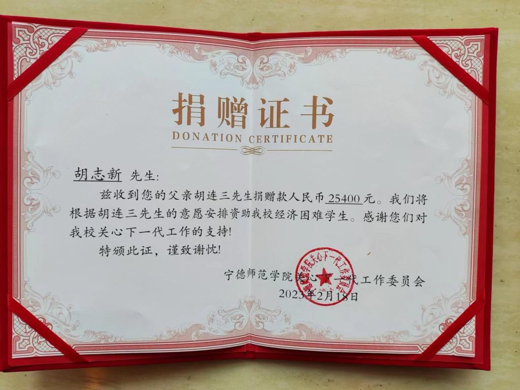 今年2月17日,宁德师范学院财务处收到了一笔25400元资助学生的捐款。这是宁德师范学院退休教师胡连三老师的最后一笔助学金,88岁的胡老师临终前嘱咐自己孩子将其工资卡剩余的两万多元用于资助学生。