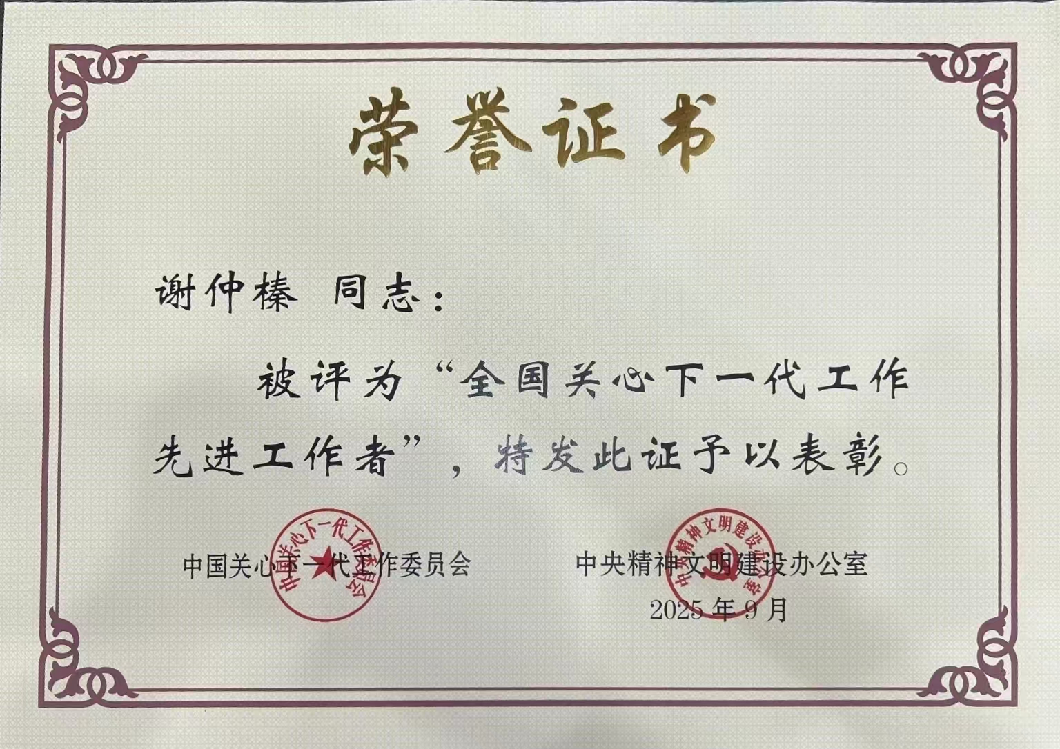 此次获评“全国关心下一代工作先进工作者”,既是对谢仲榛个人长期奉献的高度肯定,更是对我校关工委多年来深耕立德树人、关心下一代工作所取得成绩的集中体现。下一步,我校将充分发挥老同志的政治优势、经验优势、威望优势,推动关心下一代事业不断迈上新台阶,为党和国家培养更多堪当民族复兴重任的时代新人。